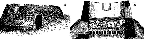 66. Печь для сжигания трупов людей, умерших от чумы.А — наружный вид печи для обжигания кирпича. Б — разрез той жепечи, приспособленной для сжигания трупов