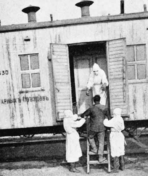 До начала эпидемии легочной чумы на территории Приморского края ОСИК подчинялись: противочумной поезд (рис. 86); городские сани-тарно-эпидемические организации края (в Ольге, Никольске-Уссурий-ском, Шкотове); организации Уссурийской железной дороги такого же назначения. Они, в свою очередь, имели подчиненные им организации (дезинфекционные отряды и похоронные отряды в Шкотове и на железной дороге, пропускные пункты в Никольске-Уссурийском, склады для хранения имущества противочумных организаций, «чумные вагоны»).