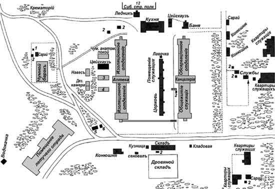 С момента появления чумы в крае (17 марта), во Владивостоке, на базе «Первого Владивостокского Крепостного военного на материке госпиталя», был развернут чумной городок. Он включал: летучий отряд, дезинфекционный отряд, крематорий, обсервационное отделение, изолятор, анатомический покой, чумной барак и диагностическую лабораторию (рис. 87).