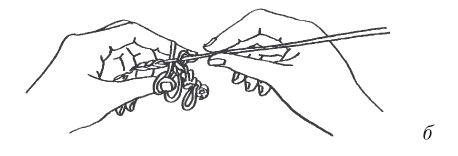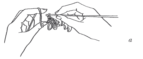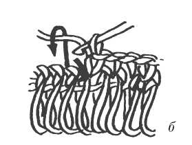 Способ 2 (рис. 38) – на карандаш или рейку наматывают нить и вяжут столбики без накида (рис. 38, а). Между каждым рядом бахромы вяжут 1–2 ряда столбиками без накида или столбиками с накидом (рис. 38, б).