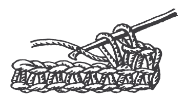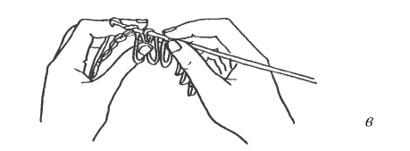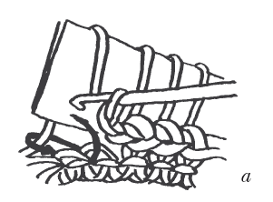 Бахрома . Бахрому можно вязать двумя способами: с лицевой и изнаночной стороны. Способ 1 – бахрому начинают вязать так: нить накидывают на большой палец левой руки и делают петлю (рис. 37, а). Потом кладут крючок на нить сверху и вводят его в основную петлю предыдущего ряда (рис. 37, б). Берут нить и вяжут столбики без накида (рис. 37, в). Обратный ряд провязывают столбиками без накида или столбиками с накидом – в зависимости