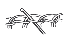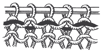 Научившись вязать образцы одним цветом ниток, вы сможете выполнить и следующее задание: связать образцы, выполненные двумя цветами . При этом следует помнить, что смена ниток является главной задачей в этом виде вязания. Нитка, находящаяся в нерабочем состоянии, не отрезается, а проходит ровными стежками по изнаночной стороне работы (рис. 41).