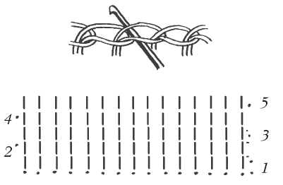 Узор «вертикальные полоски» Выполняется столбиками с накидом . 1-й ряд провязать столбиками с накидом по одному на каждой петле цепочки. При вязании столбиков 2-го ряда вводить крючок под столбики предыдущего ряда справа налево то спереди, то сзади. Получатся выпуклые и плоские столбики, чередование которых в узоре опять-таки напоминает вязание на спицах. Вязать все нечетные столбики выпуклыми, а четные – плоскими. Закончив 2-й ряд вязания, повернуть работу наизнанку, связать 2 воздушные петли вместо 1-го столбика и выполнить 3-й ряд, следя за тем, чтобы выпуклые столбики 3-го ряда были расположены над выпуклыми столбиками 1-го ряда, а плоские – над плоскими.