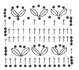 Выполняется из сочетания различных элементов . 1-й ряд вывязать столбиками с накидом. 2-й ряд – «рогатки» из листиков (рис. 44). В листике 3 недовязанных столбика с накидом, между листиками «рогатки» – по 3 воздушные петли. Между «рогатками» пропускать по 3 петли. 3-й ряд вязать столбиками с накидом, по 3 столбика под каждую цепочку и по одному столбику между «рогатками». 4-й ряд вязать столбиками с накидом по одному на каждом столбике предыдущего ряда. 5-й ряд вязать столбиками с накидом на каждой 2-й петле основания, между столбиками 1 воздушная петля – «решетка». 6-й ряд вязать «рогатками» из листиков, вводя крючок под каждую 2-ю воздушную петлю. 7-й ряд вязать как 2-й. 8-й ряд – как 3-й. В узоре листики выполнять с лицевой стороны вязания.