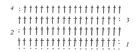Выполняется из столбиков без накида . Надо связать ряд столбиков на цепочке воздушных петель основания (рис. 42). Повернуть работу изнаночной стороной к себе и начинать вязать 2-й ряд. Вместо 1-го столбика связать цепочку из 2-х воздушных петель, затем сделать столбики, вводя крючок под обе половинки петель столбиков 1-го ряда. 1-й столбик после цепочки расположить над 2-м столбиком предыдущего ряда, последний – на цепочке из 2-х петель. Закончив 2-й ряд, снова повернуть работу и вязать 3-й ряд столбиков. Провязав так 10 рядов, вы научитесь основному виду вязания узоров.
