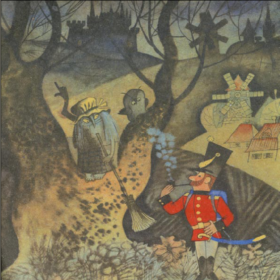 Шел солдат по дороге: раз-два! раз-два! Ранец за спиной, сабля на боку; он шел домой с войны. На дороге встретилась ему старая ведьма — безобразная, противная: нижняя губа висела у нее