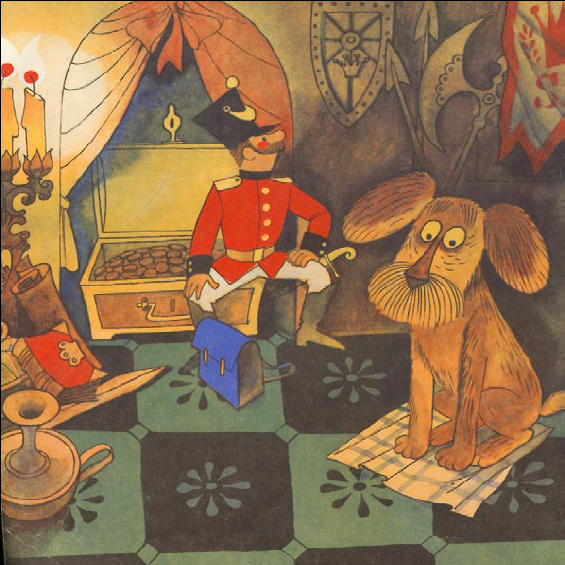 — Нечего тебе таращиться на меня, глаза заболят! — сказал солдат и посадил собаку на ведьмин передник. Увидев в сундуке огромную кучу серебра, он выбросил все медяки и набил оба кармана и ранец серебром. Затем солдат пошел в третью комнату. Фу ты пропасть! У этой собаки глаза были ни дать ни взять две круглые башни и вертелись, точно колеса.