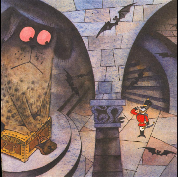 Вот он открыл первую дверь. Ох! Там сидела собака с глазами, как чайные чашки, и таращилась на солдата.