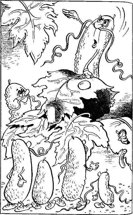 Но сегодня все было иначе. Сначала добрый старик чихнул. Он чихнул раз, другой, третий. И чихнул бы, наверное, четвертый раз, но догадался открыть глаза. И страшно удивился. А удивляться было чему. Прежде всего он взглянул на небо и не увидел там солнца. Более того, само небо изменило свой цвет. Из голубого оно стало зеленым. И по этому небу вместо облаков ползли какие-то светло-зеленые букашки. Вокруг был сырой холодный полумрак. Но более всего Помидоренко удивился тому, что прямо перед его носом висел на плети здоровенный зеленый огурец и скалил в полумраке зубы.