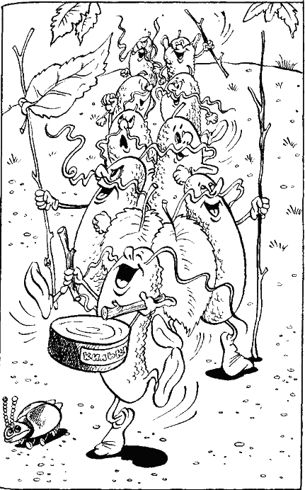 Тут же был объявлен рекрутский набор огурчиков, хотя от желающих пройтись парадным маршем перед Его Величеством Огурцием Первым и так не было отбоя. Среди новобранцев нашелся даже один поэтически одаренный Огурчик, который тут же на ходу сочинил походную песню. Он ее запел, а остальные подхватили. Это было очень просто, потому что в припеве было только два слова: ать и два. Огурчик пел так: Мы, мы, мы – огурцы.Ать-два-ать.Все, все, все – молодцы.Ать-два-ать.Все как один – удальцы.Ать-два-ать.Все как один – храбрецы.Ать-два!Остальные подхватили, разумеется, со вставкой «ать-два».