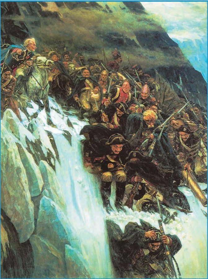 Выше – молодые воины, на их лицах улыбки, боевой задор. Здесь же, рядом с солдатами, на самом краю ледяной пропасти – Суворов. Незадолго до перехода он обратился к ним с речью: «Мы на краю пропасти… Помощи ждать неоткуда. Единственная надежда на храбрость и самоотверженность русского войска». В самый напряжённый момент Суворов со своими солдатами, он подбадривает их шутками, внушает уверенность в победе.