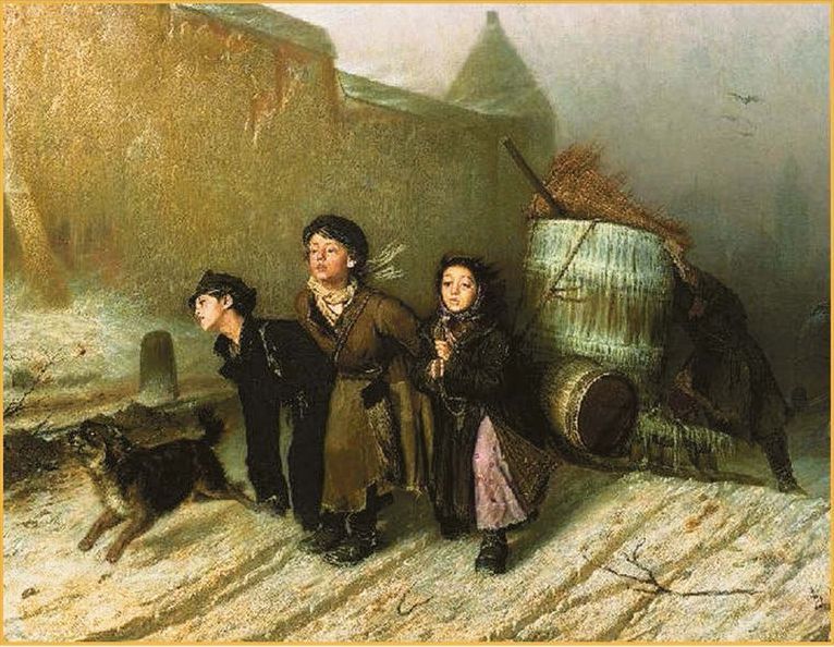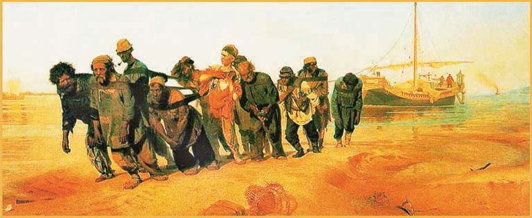Картины Василия Григорьевича Перова «Тройка» и «Приезд гувернантки в купеческий дом», Ильи Ефимовича Репина «Бурлаки на Волге» дают нам возможность представить жизнь разных слоёв русского общества.