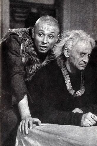 На шута в привычном представлении - такого, какого мы привыкли видеть на старинных гравюрах и рисунках, он и в самом деле не похож. Этот шут - плод творческой фантазии режиссера и актера. Никаких традиционных примет - ни шутовского колпака, ни бубенчиков. И все же в нем есть то, что роднит его со всеми другими шутами,- его ремесло.