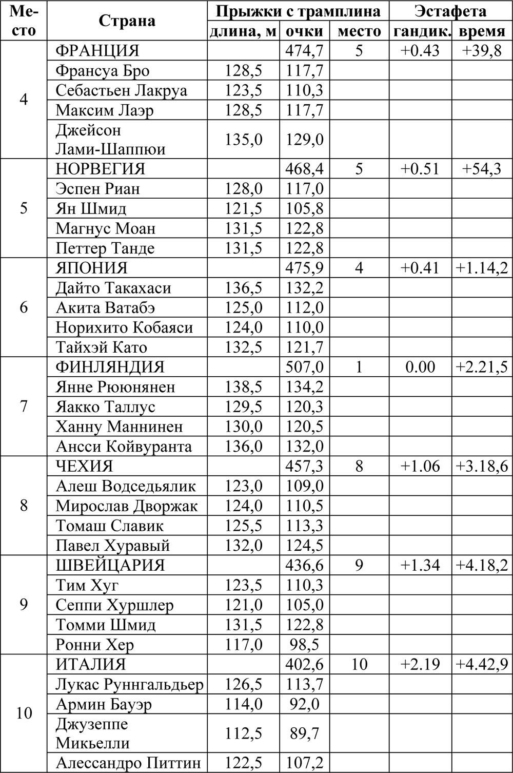 В финале до четвёртой передачи эстафеты и большую часть пятого этапа спортсмены прошли плотной группой. Незадолго до своего финиша Тим Чарнке ушёл в отрыв, создав при передаче этапа небольшое, около двух секунд, преимущество Акселю Тайхману. Тайхман лидировал до предфинишного подъёма, и попытку догнать его предприняли лишь Петтер Нортуг, Алексей Петухов и Алексей Полтаранин. Полтаранин отстал на подъёме, и в конечном итоге сборная Казахстана заняла пятое место, проиграв также канадцам. Нортуг на подъёме обошёл Тайхмана, выиграл золотую медаль для сборной Норвегии, а Петухов почти его догнал, так что второе и третье место пришлось разделять при помощи фотофиниша.