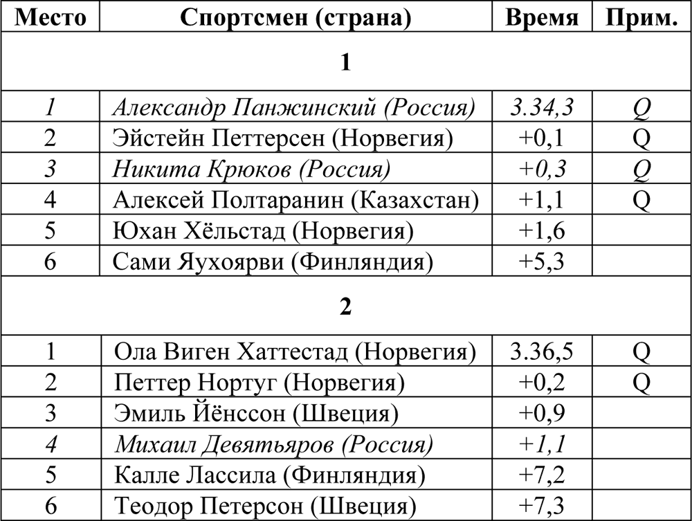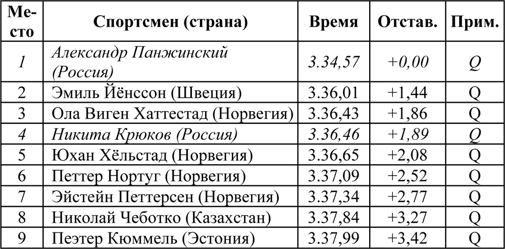 Квалификацию выиграл россиянин Александр Панжинский, опередив лидеров спринтерского зачёта Кубка мира шведа Эмиля Йёнссона и норвежца Ола Виген Хаттестада.