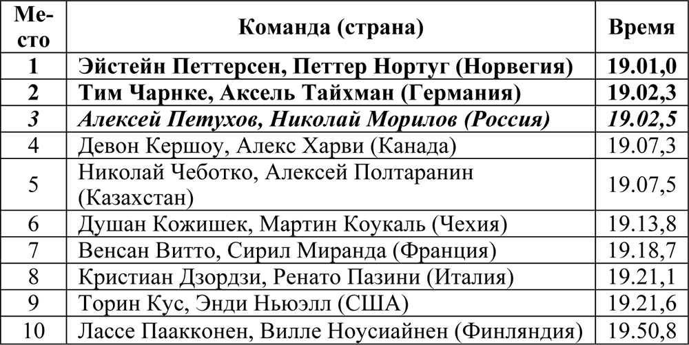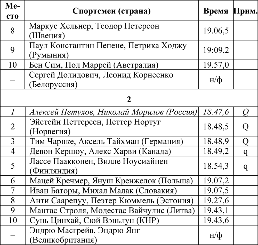 В финальном забеге два россиянина вырвались вперёд и финишировали одновременно, опередив бронзового призёра Петтера Нортуга; для определения победителя потребовался фотофиниш. На следующий день Никита Крюков и Александр Панжинский прямо в Олимпийской деревне Ванкувера были удостоены звания заслуженный мастер спорта России.