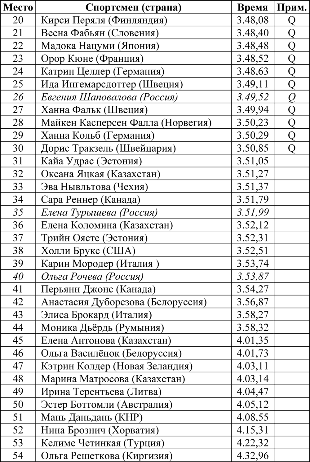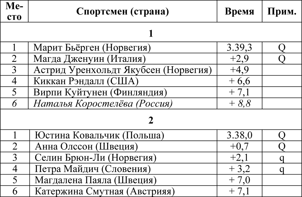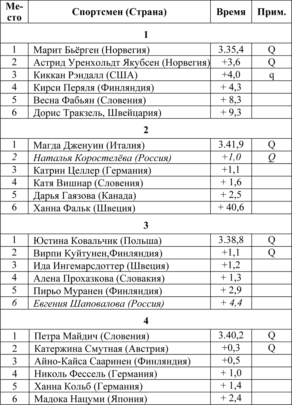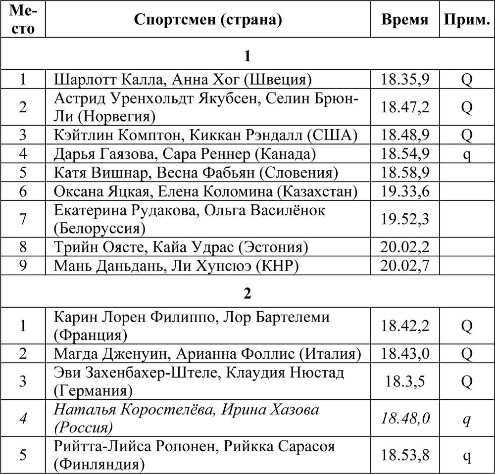 тридцать спортсменок проходят в четвертьфинал (Q).Четвертьфиналы. В каждом четвертьфинале две победительницы проходят в полуфинал(Q). Также в полуфинал проходят две участницы с лучшим временем из всех остальных спорстменок (q).