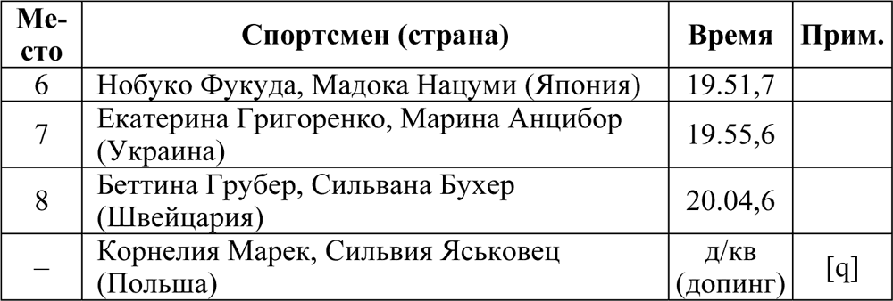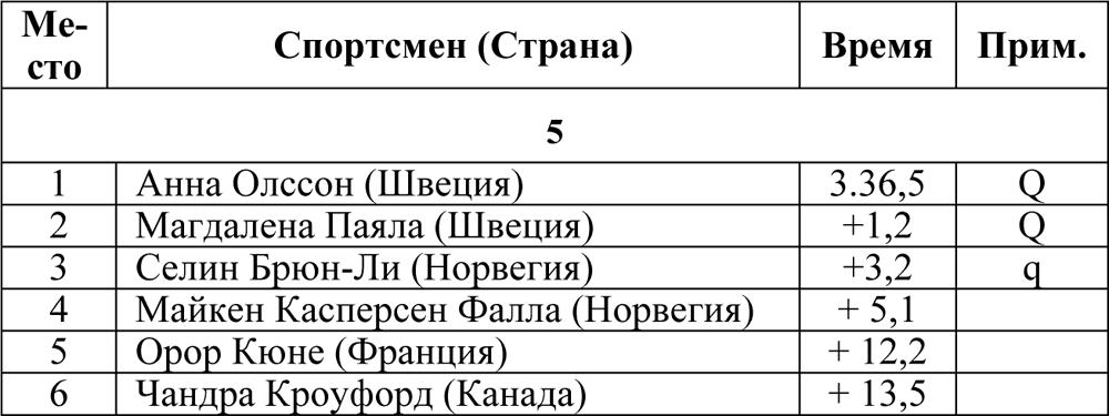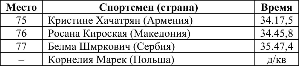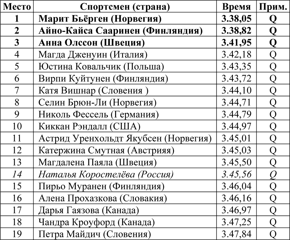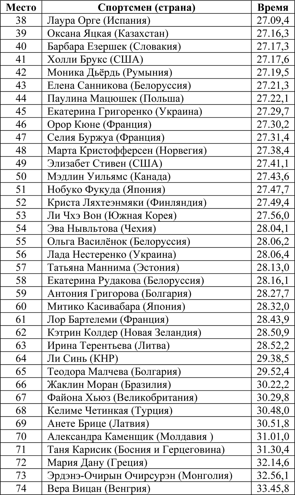 тридцать спортсменок проходят в четвертьфинал (Q).Четвертьфиналы. В каждом четвертьфинале две победительницы проходят в полуфинал(Q). Также в полуфинал проходят две участницы с лучшим временем из всех остальных спорстменок (q).