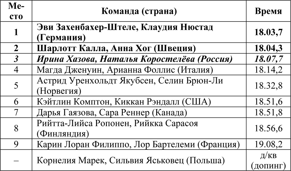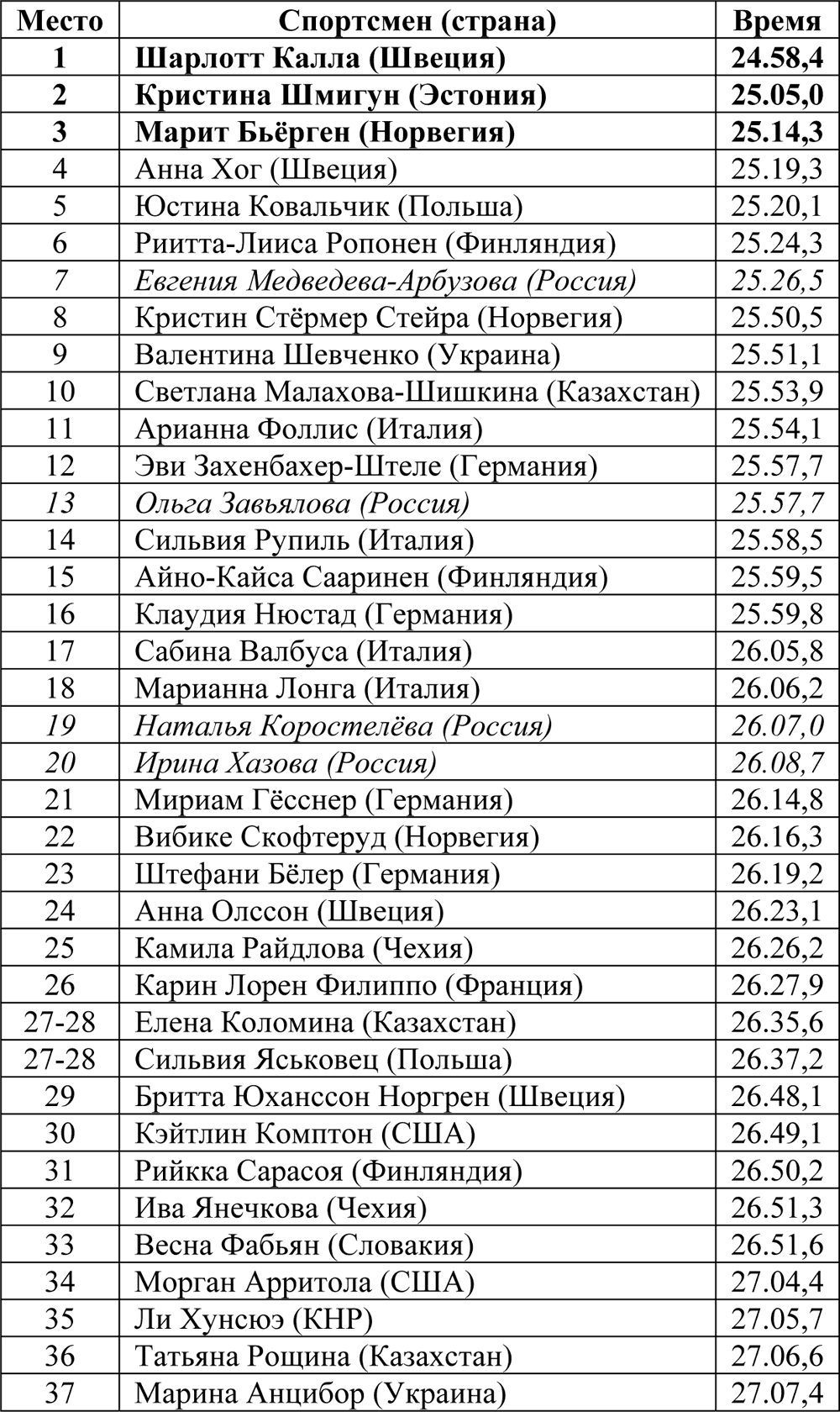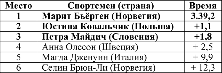 Бьёрген, обладательница трёх олимпийских медалей, впервые стала олимпийской чемпионкой, а Ковальчик к бронзовой медали на дистанции 30 км в Турине добавила серебряную в Ванкувере. Для Майдич бронзовая медаль стала первой на Олимпийских играх. Это также первая медаль Словении в лыжных гонках и пятая на зимних Олимпийских играх (все пять медалей – бронзовые).