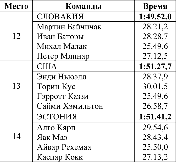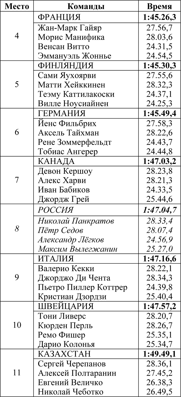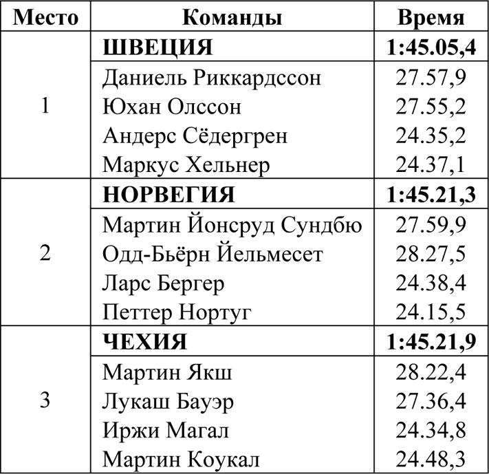 Олимпийские чемпионы 2006 года сборная Италии, сохранившая три из четырёх лыжников прошлого состава, заняла девятое место, более двух минут проиграв чемпионам.