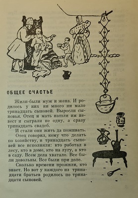 А вот сказка «Общее Счастье». Эта народная сказка учит дружно жить и трудиться. Счастье одного человека - слишком маленькое, но счастье всего народа - вот настоящее, большое счастье.