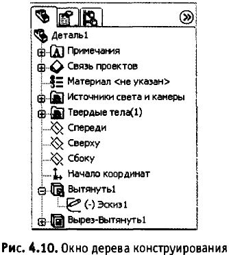 При работе с любой деталью в SolidWorks на экране кроме окна, в котором отображается модель, выводится окно, содержащее дерево конструирования.