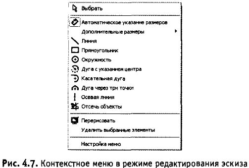 Например, в режиме редактирования эскиза при щелчке правой кнопкой мыши на экране появится меню, показанное на рис. 4.7.