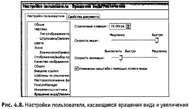 Для настройки углового шага поворота модели с помощью клавиш со стрелками, скорости мыши и анимации служит диалоговое окно, вызываемое командой Инструменты Параметры (рис. 4.8).