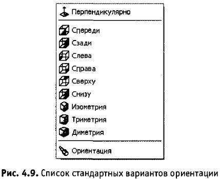 Часто требуется ориентация, при которой одна из плоскостей проекций параллельна плоскости экрана (в этом случае изображение модели соответствует ее изображению на чертеже в стандартной проекции, например, на виде сверху или слева). Такую ориентацию трудно получить, поворачивая модель мышью. В этом случае для изменения ориентации можно пользоваться предусмотренным системой списком готовых вариантов ориентации.
