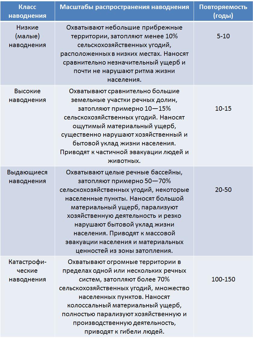 По повторяемости, размерам (масштабам) и наносимому суммарному ущербу наводнения делятся на четыре группы — низкие, высокие, выдающиеся и катастрофические. Масштабы распространения и повторяемости наводнений по группам приведены в таблице 1.