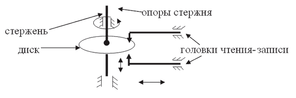 Головки чтения-записи могут синхронно перемещаться в горизонтальном и вертикальном направлении (это показано стрелками), что позволяет им приблизиться к любой точке поверхности диска. Каждая точка поверхности рассматривается как отдельный бит внешней памяти.