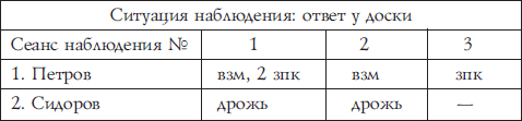 Обозначим весомость каждого признака. Так, условимся, что за выраженную дрожь будем начислять 3 очка, за выраженную вазомоторику (взм) – 2 очка, а за единичную речевую запинку (зпк) – 1 очко. Тогда фрагмент типичного протокола наблюдения будет иметь следующий вид: