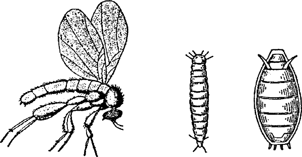 Рис. 43. Пчелиная муха-горбунья, ее личинка (голова внизу) и куколка