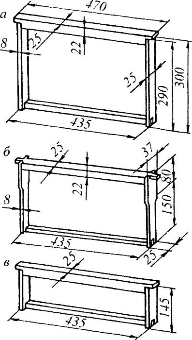 Рис. 5. Ульевые рамки: а – стандартная гнездовая; б – многокорпусного улья с постоянным разделителем; в – магазинная полурамка (надставка)