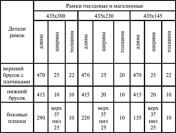 В нашей стране приняты единые стандартные рамки: гнездовые для 12-рамочных, двухкорпусных ульев и лежаков с наружными размерами 435 x 300 мм, магазинные – 435 x 145 (или на 150) мм, для многокорпусных ульев – 435 x 230 мм.