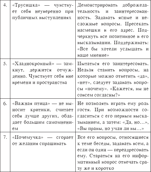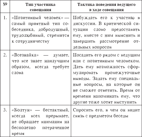 При проведении совещания ведущий имеет дело с одними и теми же типовыми моделями участников совещания. Ниже приведены основные психологические типы участников и рекомендуемые тактики (действия) по отношению к ним.