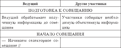 В управленческой коммуникации широко распространена практика проведения оперативного, или, иначе, селекторного, делового совещания. Цель такого совещания, как уже было отмечено выше, получение руководителем информации о текущем состоянии дел на производстве, в компании, организации. Селекторное совещание всегда проводится в одно и то же время. Участники такого совещания не имеют возможности видеть друг друга, общение осуществляется с помощью специальных технических средств.