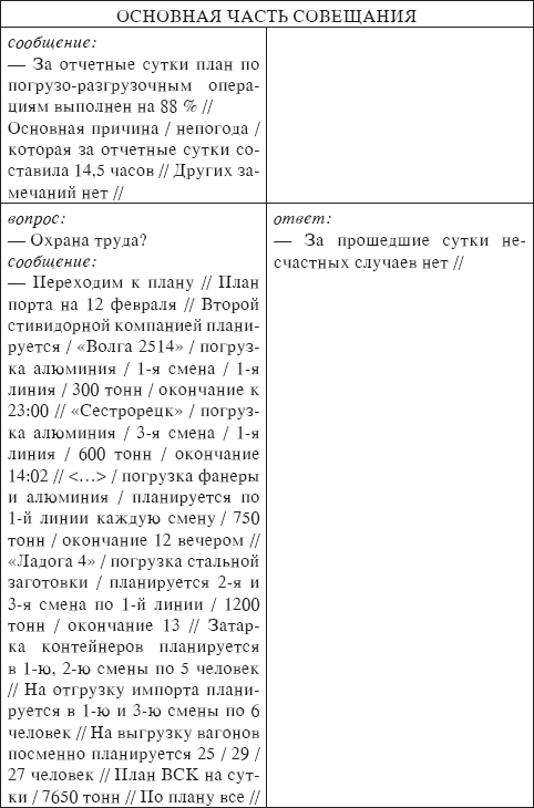 Оперативные работники совещания обеспечивают подачу информации снизу вверх по схеме управления. Участники сообщают ведущему сведения о ходе дела на местах. Доминирующая роль на таком совещании отведена руководителю подразделения, организации, именно он выполняет роль коммуникативного лидера. Получив от участников необходимую информацию, ведущий выявляет наличие «слабых мест», наметившееся отставание, причины задержки выгрузки, возникшие недоразумения. И по возможности на совещании руководитель добивается оказания необходимой помощи, дает новые поручения, с тем чтобы выдержать заданные сроки выполнения поставленных производственных задач. Например: