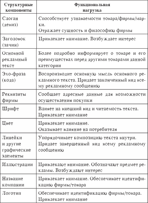 И. А. Сазонова также замечательно структурировала компоненты печатного рекламного сообщения и их функции, представив их в виде следующей (немного дополненной нами) таблицы.
