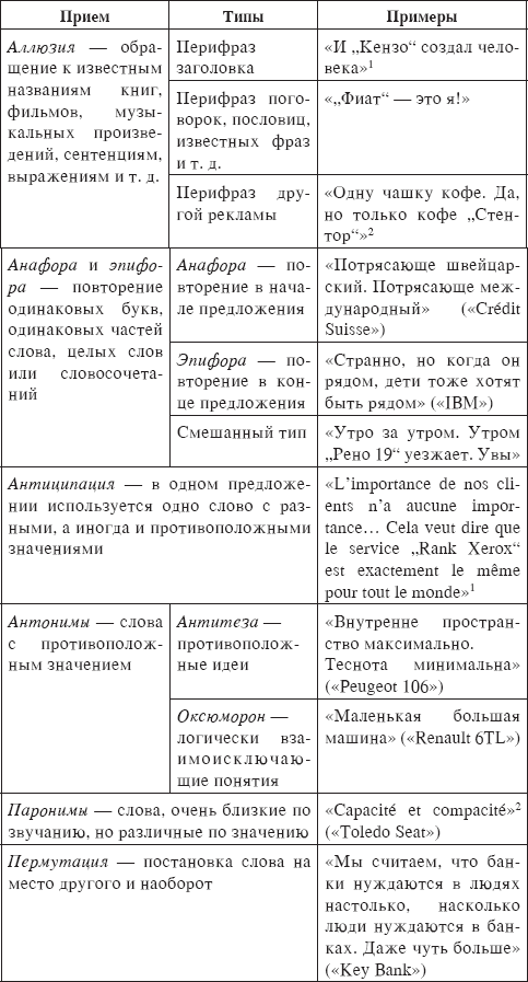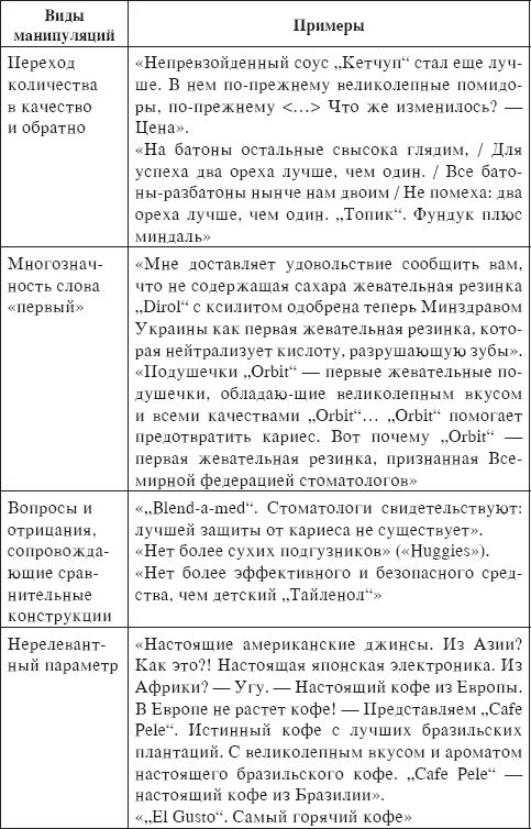Рекламисты довольно часто пользуются приемами языкового манипулирования. Иногда рекламные сообщения конкурентов, одновременно использующие аналогичные приемы, взаимно ослабляют друг друга. В ряде случаев определенный прием становится настолько популярным, что постепенно переходит в разряд рекламных клише. Тем не менее манипулятивные возможности языка чрезвычайно богаты. На службе у рекламиста и метафора, и ложная аналогия, и многозначность, и многое другое.