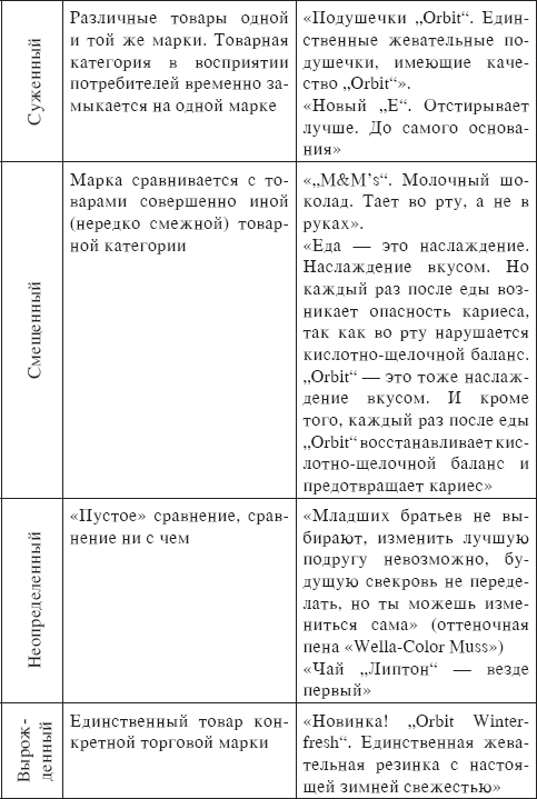 Цель основных стратегий рекламирования – выгодным образом выделить торговую марку среди конкурентов. Часто для этого используются явные или скрытые сравнения. Однако полноценные сравнения (когда ясно, какой объект с какими другими сравнивается и какие параметры принимаются во внимание) встречаются в рекламе редко. Как правило, лишь создается иллюзия настоящего сравнения, а это значит, что сравнение является некорректным в строгом логическом смысле.