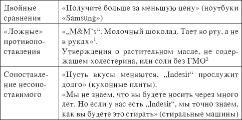Некорректные с логической точки зрения сравнения являются проявлениями манипуляций с классом сравнения и параметрами сравнения, выявленных в статье Ю. К. Пироговой. [188] Отсутствие реальных отличительных характеристик товара, выгодно выделяющих его среди конкурентов, заставляет рекламистов искать особые риторические приемы, чтобы рекламируемая марка выглядела наиболее выигрышно на фоне конкурентов. Так создается искусственный класс сравнения. Конкурирующие марки, составляющие естественный класс сравнения, при этом просто игнорируются.