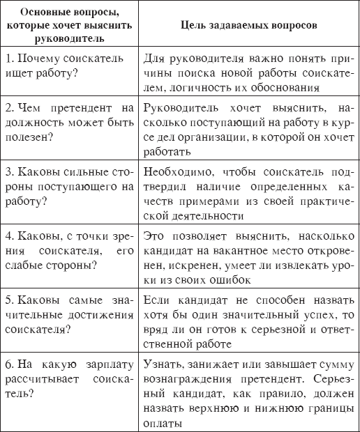 Кроме перечисленных вопросов соискателю должен быть задан вопрос о его образовании, семейном положении, предыдущих местах работы. В разговоре с претендентом руководителю также предлагается задать вопрос: «Не хотите ли вы обсудить что-нибудь, о чем мы с вами не упомянули в разговоре?».