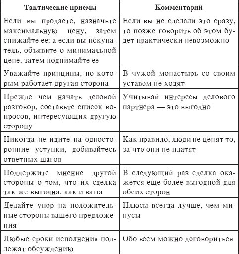 Тактика составляет самую суть переговоров. Это предпринимаемые действия и возникающая реакция участников переговоров. Для каждого конкретного случая, конкретной ситуации проведения переговоров в литературе по деловому общению выделяется множество тактических приемов. Предлагаем вам ознакомиться с некоторыми из них, [281] с тем чтобы вы могли воспользоваться данными тактиками при выполнении заданий.