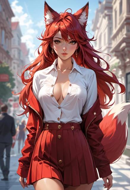 Но все это меркнет по сравнению с другой деталью внешности. На голове — длинные остроконечные ушки с кисточками. А за спиной крутится пушистый красный хвост. Зверолюдка? Но кто? Кошка? Нет, не она. Точно! Лисица!