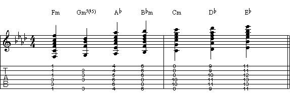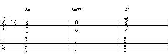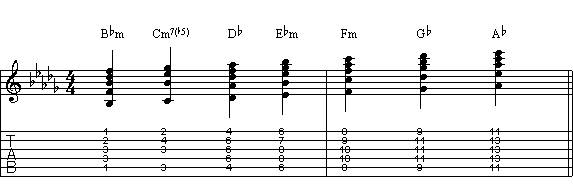 В следующем примере тоники аккордов располагаются на 5-й струне. Тональность си-бемоль минор.