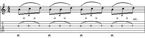 В этом упражнении исполняется повторяющаяся 3-х нотная секвенция на третьей струне, которая исполняется при помощи приема "hammer-on". Здесь задействованы 1-й, 2-й и 4-й пальцы. Первая нота каждой триоли исполняется при помощи медиатора (это касается всех упражнений этого урока). Штрих медиатора все время вниз.
