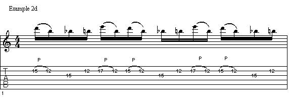 Начнем сразу со второго предложения, т. к. первое представляет интерес, в основном, из за ритмики, и если Вы его играете как на записи, то ритмическая структура отложилась у Вас в голове (попробуйте сыграть свою фразу с ритмикой используемой в первом предложении). Итак, второе предложение состоит из быстрых фраз, исполняемых при помощи приемов hammer и pull. Вот фразы из которых оно состоит. Вообще, в дальнейшем Вы должны сами видеть фразы, а пока я предлагаю их сразу.