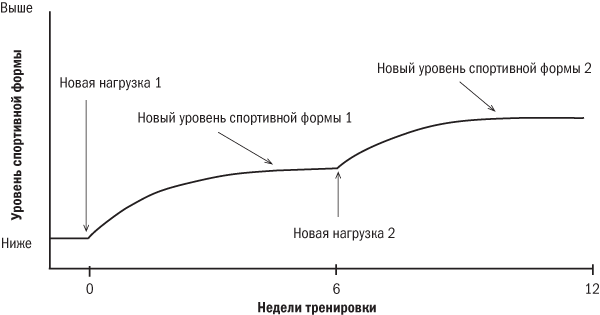 На рис. 1.1 и 1.2 вы можете заметить еще одну особенность: после введения новой тренировочной программы на первом этапе скорость достижения результатов высока, но со временем она падает. Наибольший рост спортивной формы приходится на первые шесть недель после введения новой программы. Но и на последующих этапах любая тренировочная программа продолжает приносить плоды, пусть и менее очевидные: даже без увеличения нагрузок изменение состава тела (потеря ненужного жира, например) может продолжаться, приводя, в свою очередь, к некоторому росту результатов.
