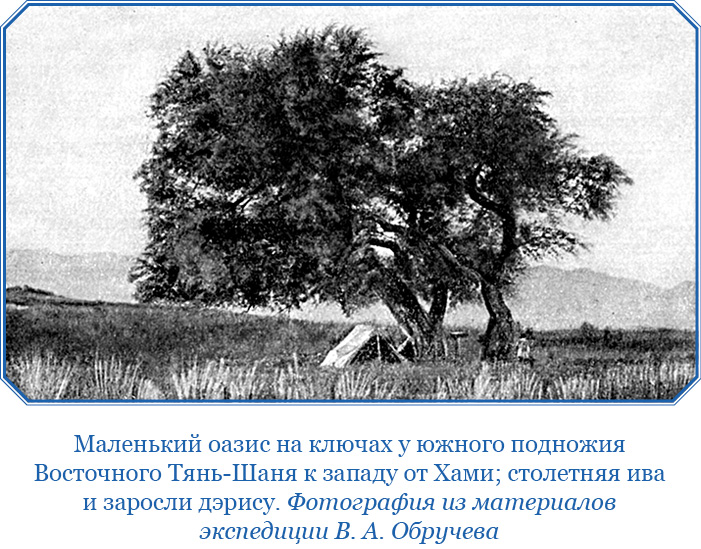 доезжая этого отрога, проехали мимо станции, пересекли весь отрог и выехали затем в обширную впадину Дуниенчжэ, ограниченную с севера самим Тянь-Шанем, а с юга этим отрогом, выдвинутым с востока, и другим подобным же, подходящим с запада. В этой впадине расположен обширный солончак с зарослями тополей, разных кустов и тростника, песчаными буграми с тамариском и хармыком, а также отдельными холмами сыпучего песка по окраинам; в промежутках везде видна глинистая почва с выцветами солей. По восточной окраине впадины тополя явно вымирают, молодые деревья видны редко, старые имеют спирально скрученную древесину в уродливо толстых стволах с толстыми короткими сучьями и скудной листвой; попадается много совсем мертвых деревьев и их пней.Путешественник Грум-Гржимайло, проехавший ранее меня по этой дороге, написал в своем отчете, что громадный лес тополей, некогда покрывавший дно котловины, безжалостно истребляется. Он не обратил внимания на то, что пни достигают самой различной высоты, даже до 4–5 м, представляя в последнем случае весь ствол, иногда с остатками сучьев; лесорубы в подобной стране, вообще очень бедной лесами, не стали бы оставлять такие пни. Кроме того, на пнях нигде не видно следов топора или пилы. Человек не повинен в истреблении этого леса, который, впрочем, никогда не был громадным, а состоял из таких же сравнительно редко стоящих деревьев, как все рощи тополя на берегах рек и в оазисах Центральной Азии. Тополь в этой впадине естественно вымирает, так как она лишена стока и в почве ее постепенно накопляется все больше и больше солей, приносимых водами, стекающими с окружающих гор. Засоление идет в основном с востока, судя по вымиранию тополей с этой стороны; гибнут не только тополя, но и тамариск на буграх и тростник в зарослях.